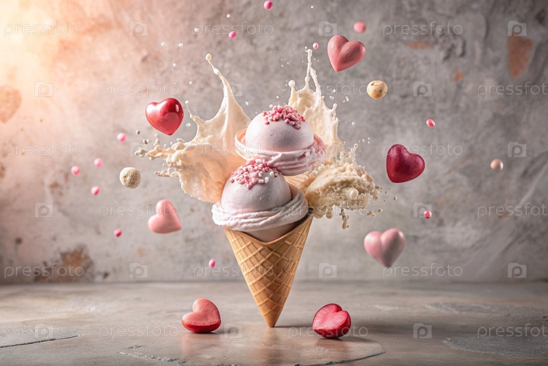 Сладкий десерт. Любовь к мороженому. Сердечно-образный конус мороженого с брызгами, сердцами и пятнами. Концепция Дня святого Валентина. Баннер, реклама