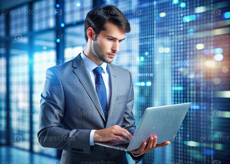 Молодой человек в костюме работает на ноутбуке в офисе с цифровыми кодами на виртуальном экране Цифровые технологии будущего Разработка программного обеспечения