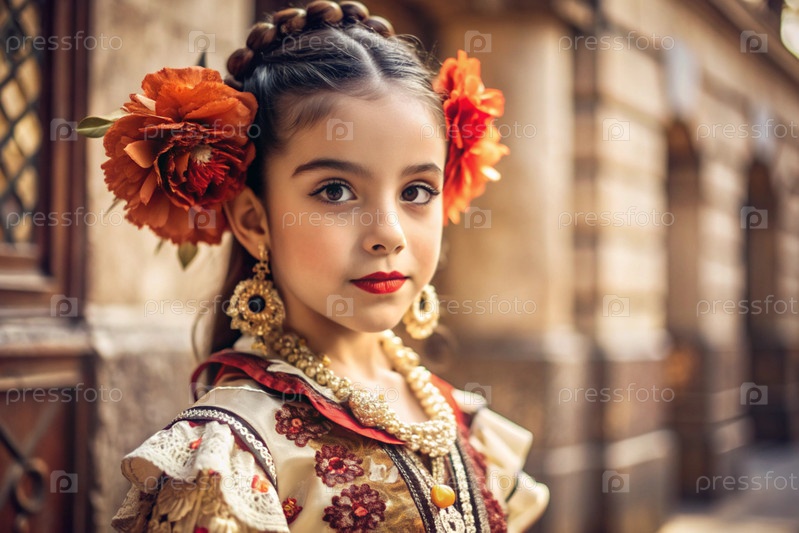 Испанская девушка в традиционном испанском национальном костюме. Перед быком. Бикоборство. Портрет символизирует традиции и культуру народа Испании