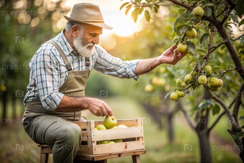 Сельскохозяйственная промышленность. Деревянный ящик с яблоками в руках фермера-мужчины. Садовник собирает богатый урожай. Ближе, солнечный свет. Осенний плодовый сбор
