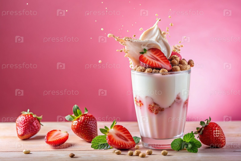 Творческий кулинарный рисунок. ближайшее наполнение клубники, клубника в стакане молока, розовый милкшейк, коктейль йогурта с жидкими каплями на розовом фоне