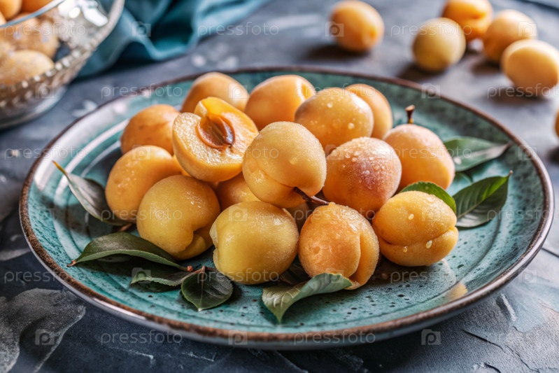 Свежие абрикосы. Вкусные ягоды и фрукты ярко-желтого цвета с капельками воды. Вегетарианство. Здоровое питание. Свежий плод на столе