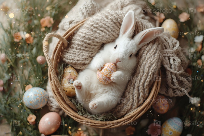 Пасхальный кролик пасхальное яйцо в лапах, лежащее на спине на сером вязанном одеяле в корзине из колючки и уставившееся в камеру