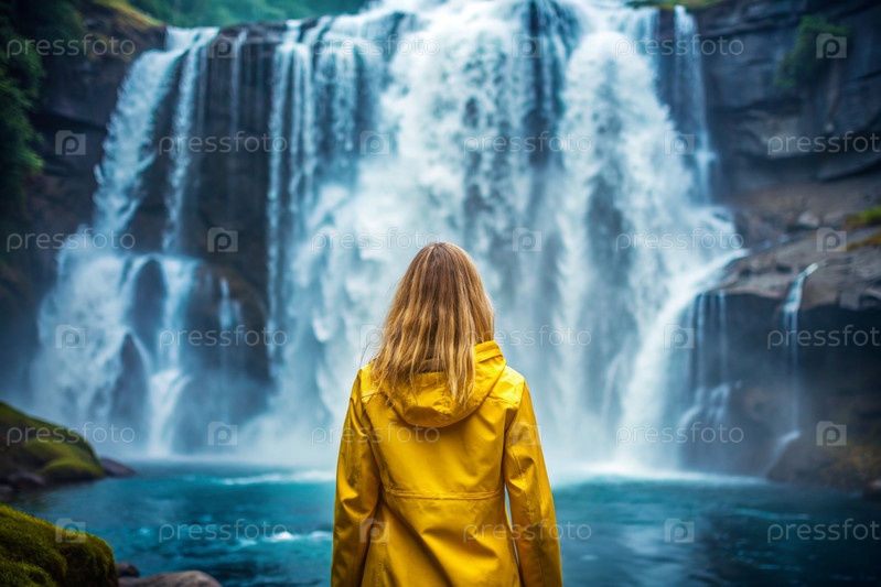 Женщина в резиновом плаще среди огромного голубого водопада. она путешествует и наслаждается жизнью и окружающей средой. туризм