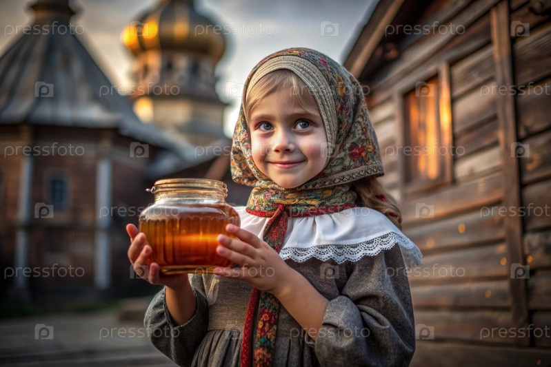 Концепция российского православного праздника 'Мед Спаситель' - красивая маленькая девочка в русской национальной одежде и шарф с баночкой меда на фоне православной церкви