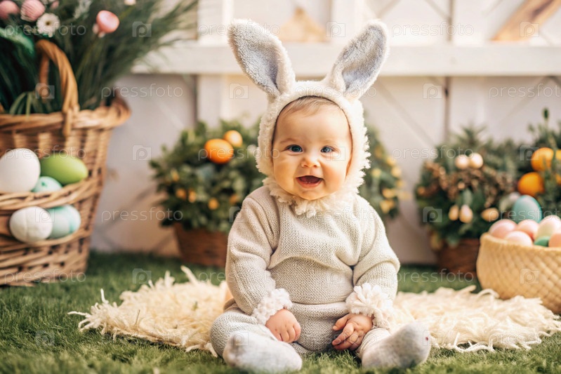 Баннер. Винтажная открытка. Мальчик в костюме пасхального кролика с милыми ушами. Концепция праздника Bright Easter Spring