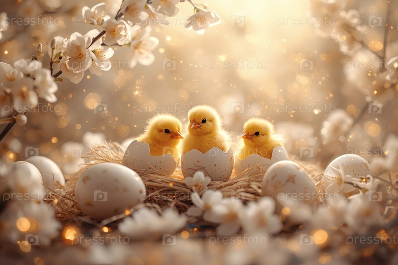 Концепция яркого Пасхального праздника. Нежные розовые пасхальные яйца, желтые курицы и вишневые ветви на деревянном фоне. Концепция ярких пасхальных праздников в 2026 году