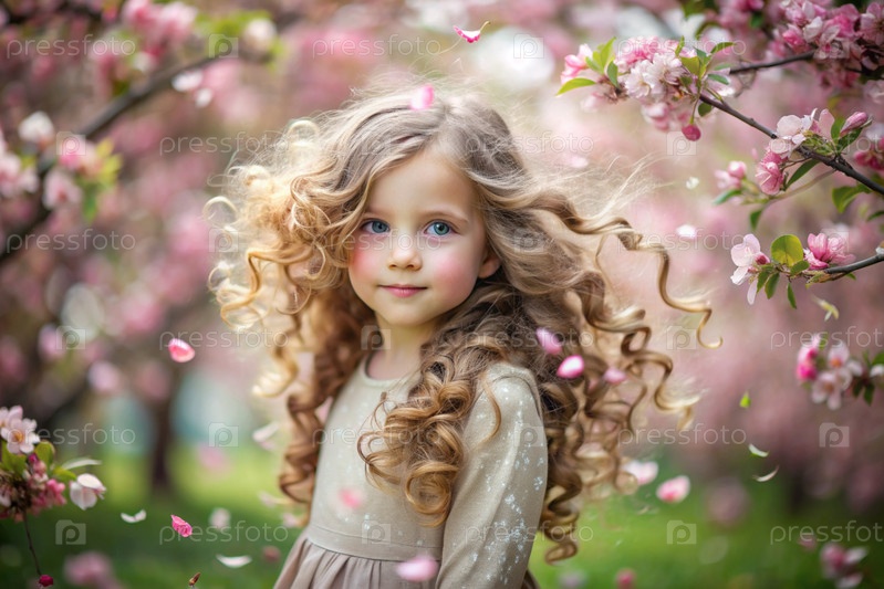 Портрет красивой маленькой кудрявой 4-летней девочки в соломенной шляпе и платье в цветущем розовом саду яблок. Детство. Ребенок позирует и смотрит на камеру