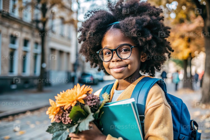 Красивая афроамериканка на очках с букетом осенних цветов впервые идет в школу. Ребенок со школьной сумкой, книгой и цветами. Малыш на городской улице