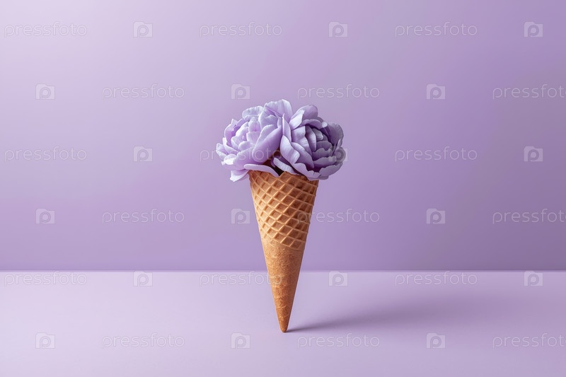 Минимальная студийная фотография. Вафельный конус. Наполненный тонкими пастельными цветами, напоминающими пионы или розы, с многослойными лепестками в мягкой сирены и голубыми оттенками на фиолетовом фоне