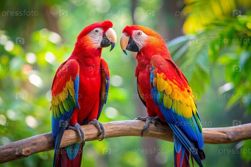 Два больших красных макак сидят на ветке на размытом тропическом фоне