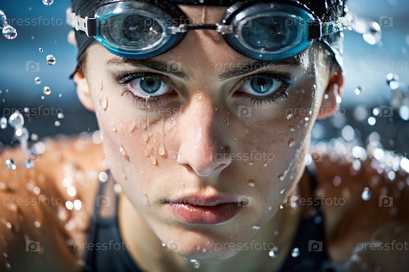 Спортивное плавание. Женское плавание. Спортсменка, которая носит очки для плавания в бассейне во время соревнований на близком расстоянии. Женщина смотрит прямо в камеру