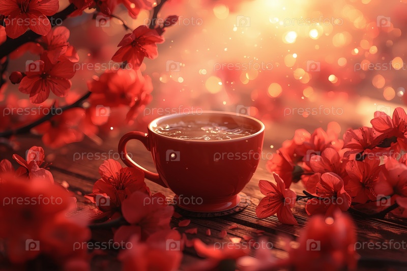 Чашка горячего кофе или чая, окруженная красными цветами и сердцами в День святого Валентина
