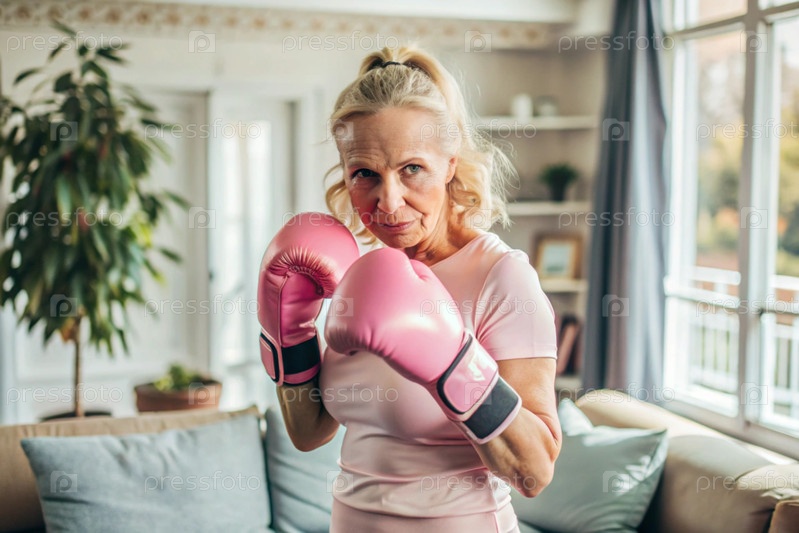 Портрет зрелой женщины: атлетичная, активная женщина средних лет в спортивной одежде и боксерских перчатках стоит на стенде и готовится к боксу дома