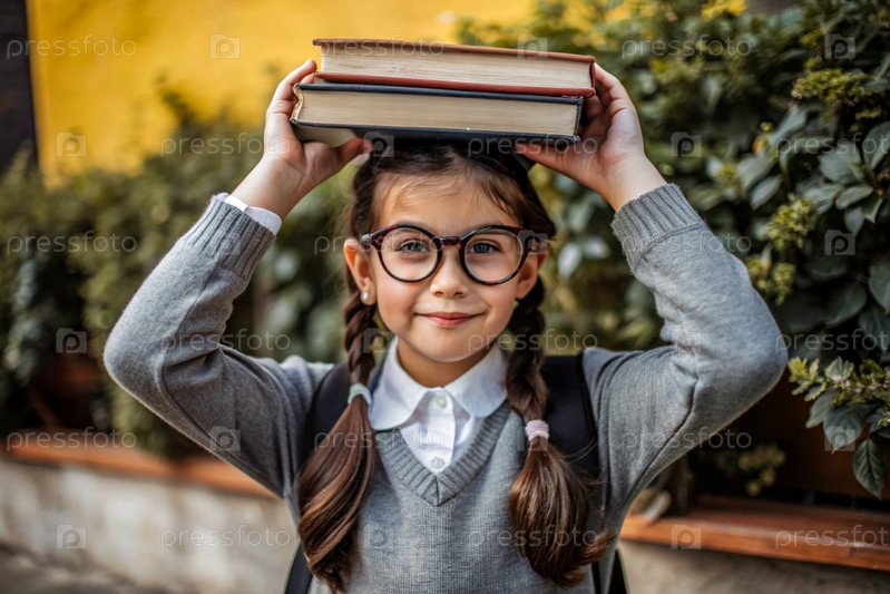 Красивая девочка с очками и книгами на голове.Ребенок впервые ходит в школу.Дети на свежем воздухе.Возвращение к школе