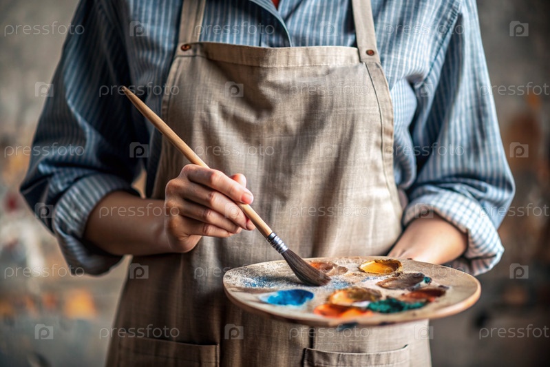 Близко. Понятие творческой деятельности. Художник в мастерской с маслом и кистью в руках. Искусство, креативность и отдых