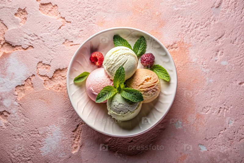 сладкий десерт. шарики мороженого с различными вкусами на бетонном розовом фоне. Всемирный день мороженого