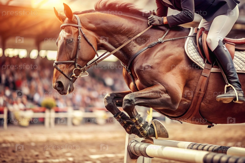 Близкий план олимпийской лошади и всадника, перепрыгивающих через препятствие на открытой арене - это конная езда