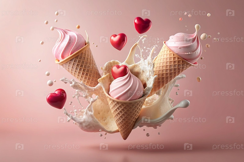 Сладкий десерт. Любовь к мороженому. Сердечно-образный конус мороженого с брызгами, сердцами и пятнами. Концепция Дня святого Валентина. Баннер, реклама