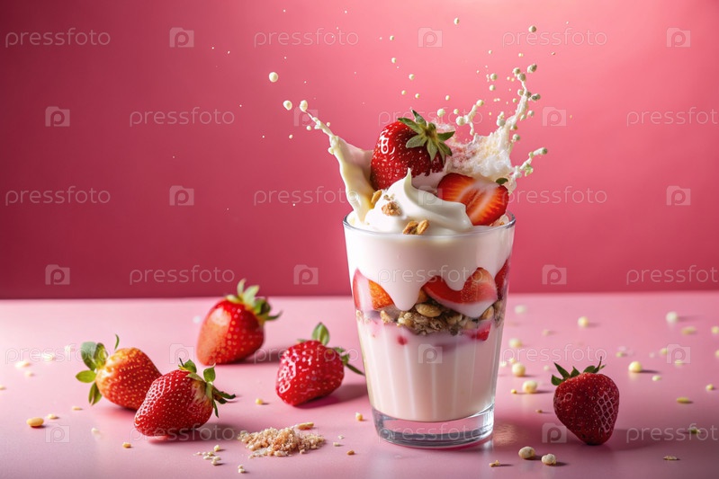 Творческий кулинарный рисунок. ближайшее наполнение клубники, клубника в стакане молока, розовый милкшейк, коктейль йогурта с жидкими каплями на розовом фоне