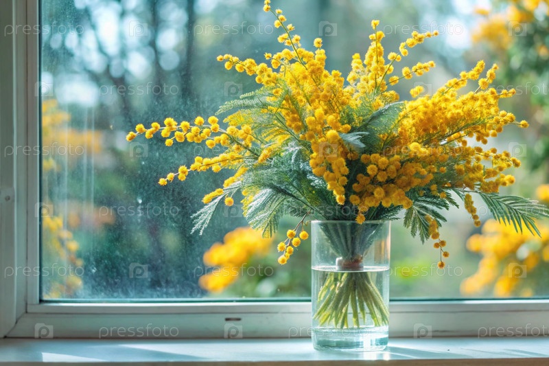 Красивый пушистый букет мимозы в вазе. Близко. Концепция домашней весны и Международный женский день 8 марта