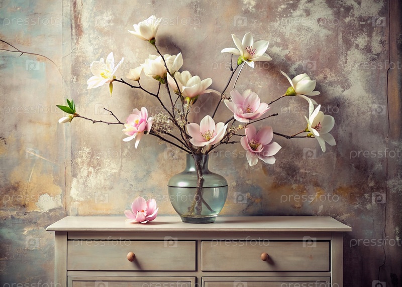 Красивая ветвь розовой магнолии в стеклянной вазе и флаконы на старом деревянном шкафу. Букет цветов в вазе в интерьере дома. Светлый, бежевый, розовый цветочный фон