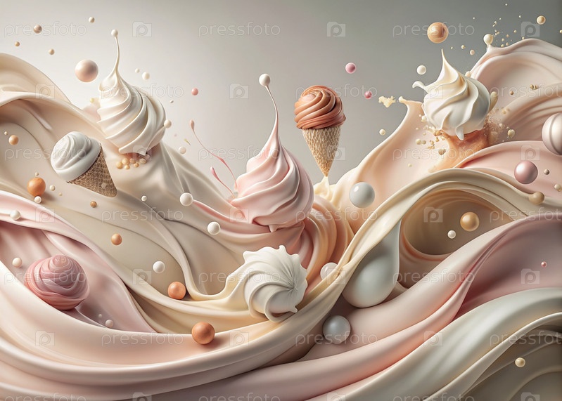 Абстрактная композиция с таяющим мороженым. Плески и брызги мороженого. натюрморт, изображающий перевернутый конус мороженого на светло-розовом фоне