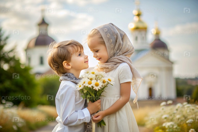 Всероссийский день семьи, любви, верности. милый мальчик и девочка с букетом ромашек на фоне православной церкви. День святого Валентина Петра и Февронии. религия, христианство