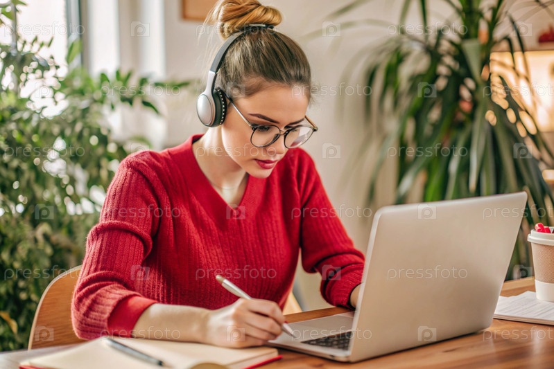 Молодая женщина фрилансер в очках и наушниках работает на ноутбуке или делает покупки в интернет-магазине