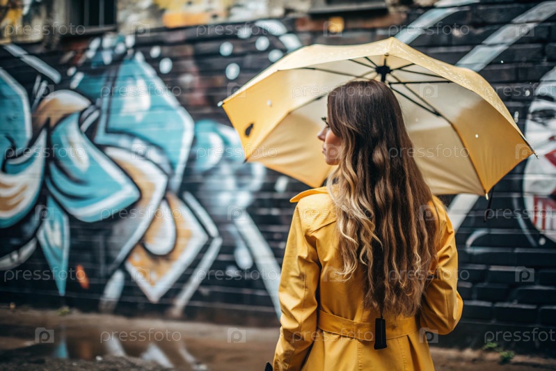 Молодая девушка в желтом плаще с зонтиком в городе на стене из граффити. Красивая молодая женщина под дождем, гуляющая по улицам города