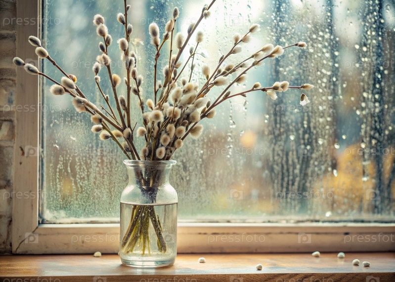 Большой план букета ивы в стеклянной вазе на фоне старого белого окна с капельками дождя на стекле