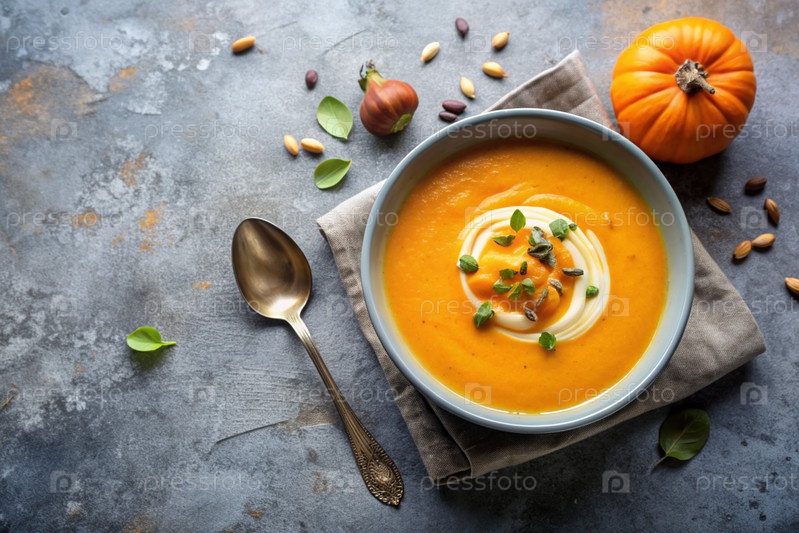 Традиционный мягкий тыквенный кремовый суп с сливками и семьями тыквы на сером бетонном фоне
