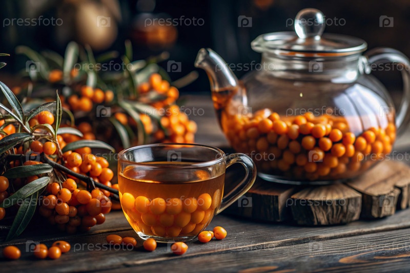 Здоровая, спелая ягода морского гречневого терна в ближайшем плане.Витамин, оранжевый, осенний, сезонный чай из ягод морского гречневого терна на темном фоне.Яблочный чай для иммунной системы