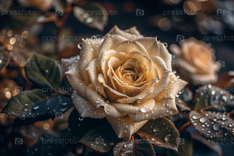 Кремовая роза красивого цвета кофе или шампанского, покрытая росой на рассвете. Красивое солнечное сияние. Фон изображения выполнен в зеленых и бежевых тонах. Естественный, экологически чистый естественный фон