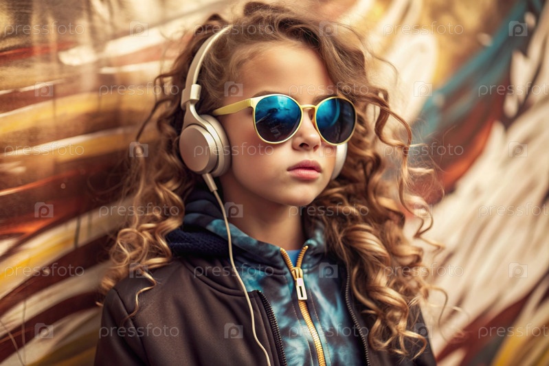 Молодая красивая девушка с большими наушниками и солнцезащитными очками слушает музыку на ушах