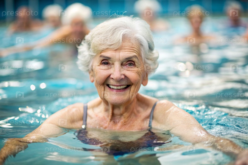 Пожилая женщина плавает и занимается водной аэробикой в отопительном бассейне, счастливый и улыбающийся пенсионер