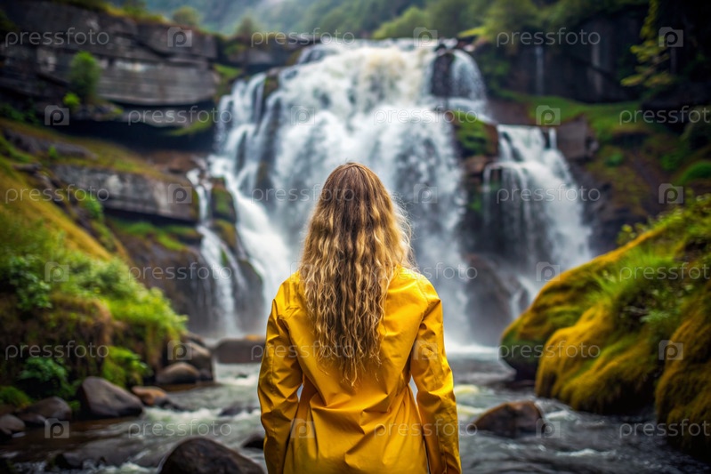 Женщина в резиновом плаще среди огромного голубого водопада. она путешествует и наслаждается жизнью и окружающей средой. туризм