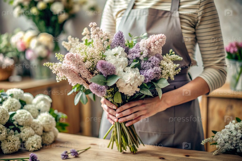 Малый бизнес. Декоратор-цветочник держит красивый деликатный букет цветов для покупателя. Цветочное оформление. Доставка цветов, обработка заказов