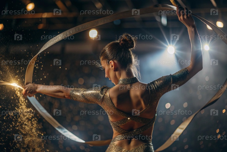 Ритмическая гимнастика - это крупный план красивой гимнастки с лентой в центре внимания на спортивной арене