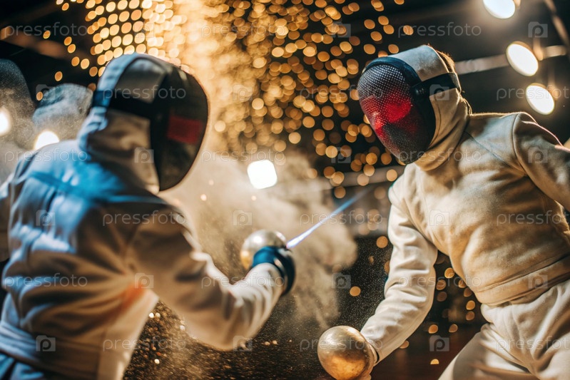 Фехтовальщики на арене с рапирами в руках во время тренировок дерутся в дуэли. Спортивное фехтование. Фехтование является типом летних Олимпийских игр