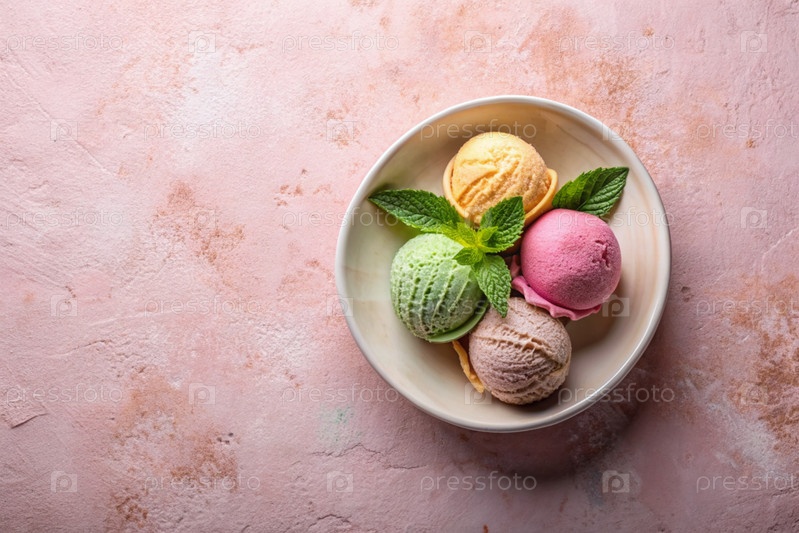 сладкий десерт. шарики мороженого с различными вкусами на бетонном розовом фоне. Всемирный день мороженого