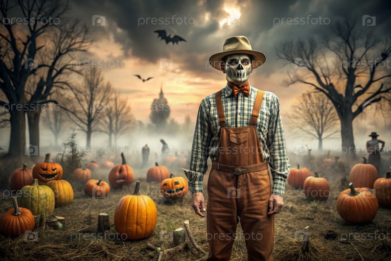 Концепция Хэллоуина. Ужасная. Страх. Устрашающий богий с тыквенной головой, квадратной рубашкой и бабочкой. Баннер, открытка