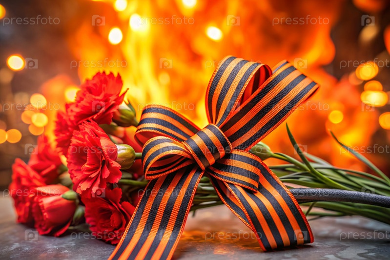 Знамя 9 мая Красные гвозди и Георгиевская лента на фоне огня Концепция Дня Великой Победы 1941-1945 годов и День защитника Отечества