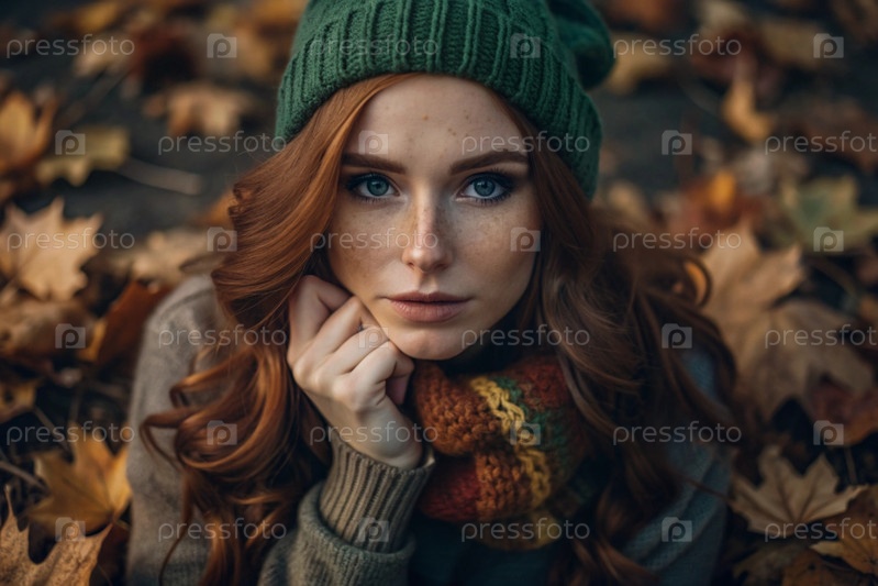Осенний портрет. Близкий план молодой рыжеволосой женщины с выразительными зелеными глазами в вязанной шляпе и свитере