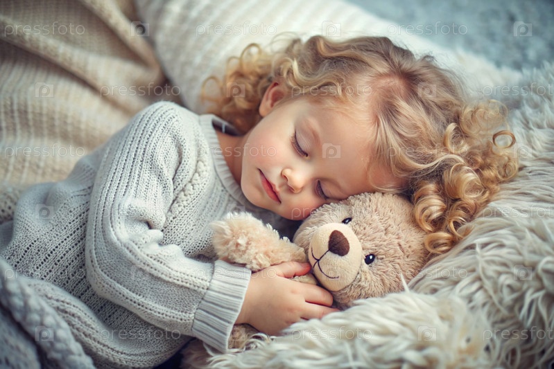 Маленькая блондинка с кудрявыми длинными светлыми волосами спит в своей кровати, обнимая плюшевого медведя