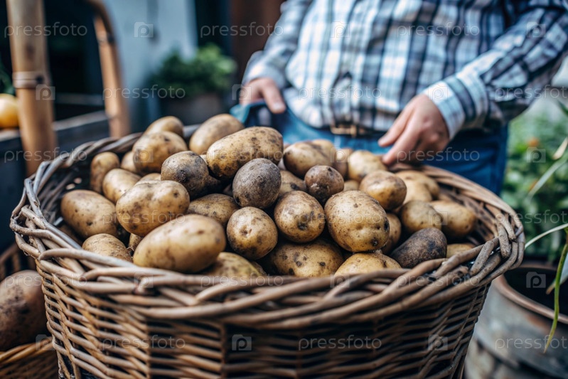 Концепция выращивания продуктов питания. свежие органические картофели на фермерском рынке. богатый урожай клубней в плетеновой корзине