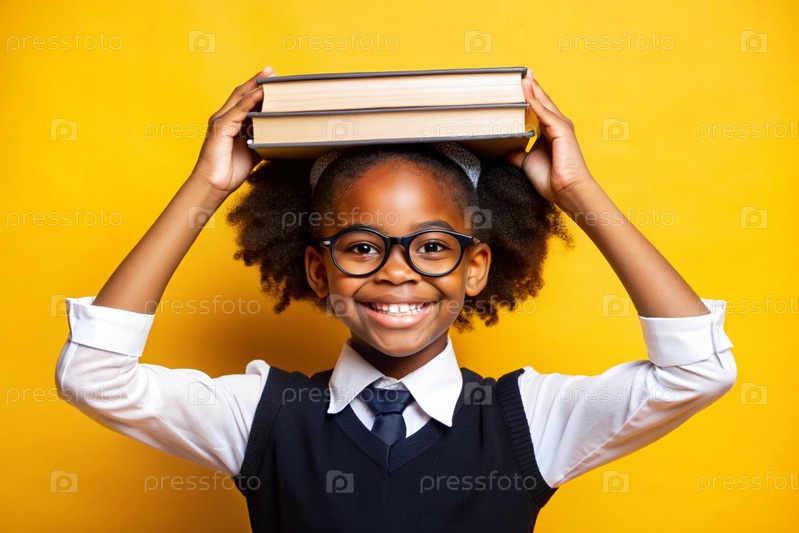 Красивая афроамериканская девушка с очками и книгами. Ребенок впервые ходит в школу. Ребёнок на желтом монохромном фоне