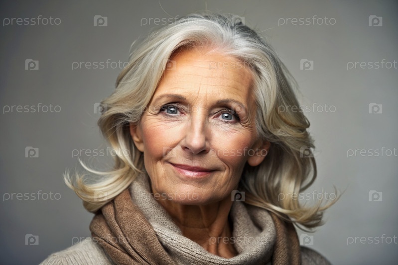 Минимализм.Студийный портрет стильной, элегантной пожилой женщины, 70-летнего пенсионера в интерьере и одежде спокойных тонов.Концепция пожилых людей