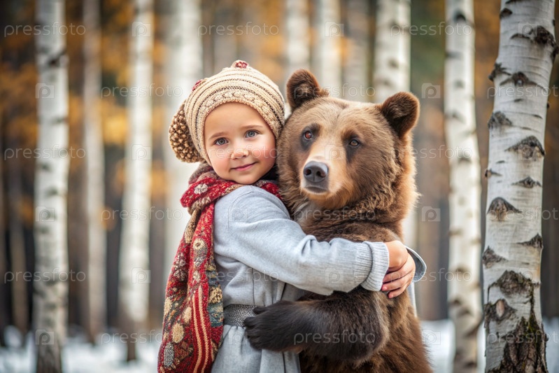 Красивая маленькая девочка в русской народной одежде и с платками на голове в березовой роще с живым медведем Русский фольклор, славянская мифология