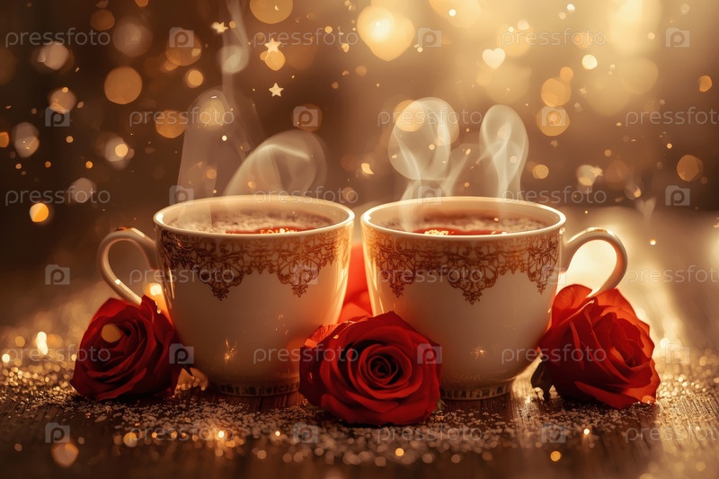 Чашки горячего кофе или чая, окруженные красными цветами и сердцами в День святого Валентина